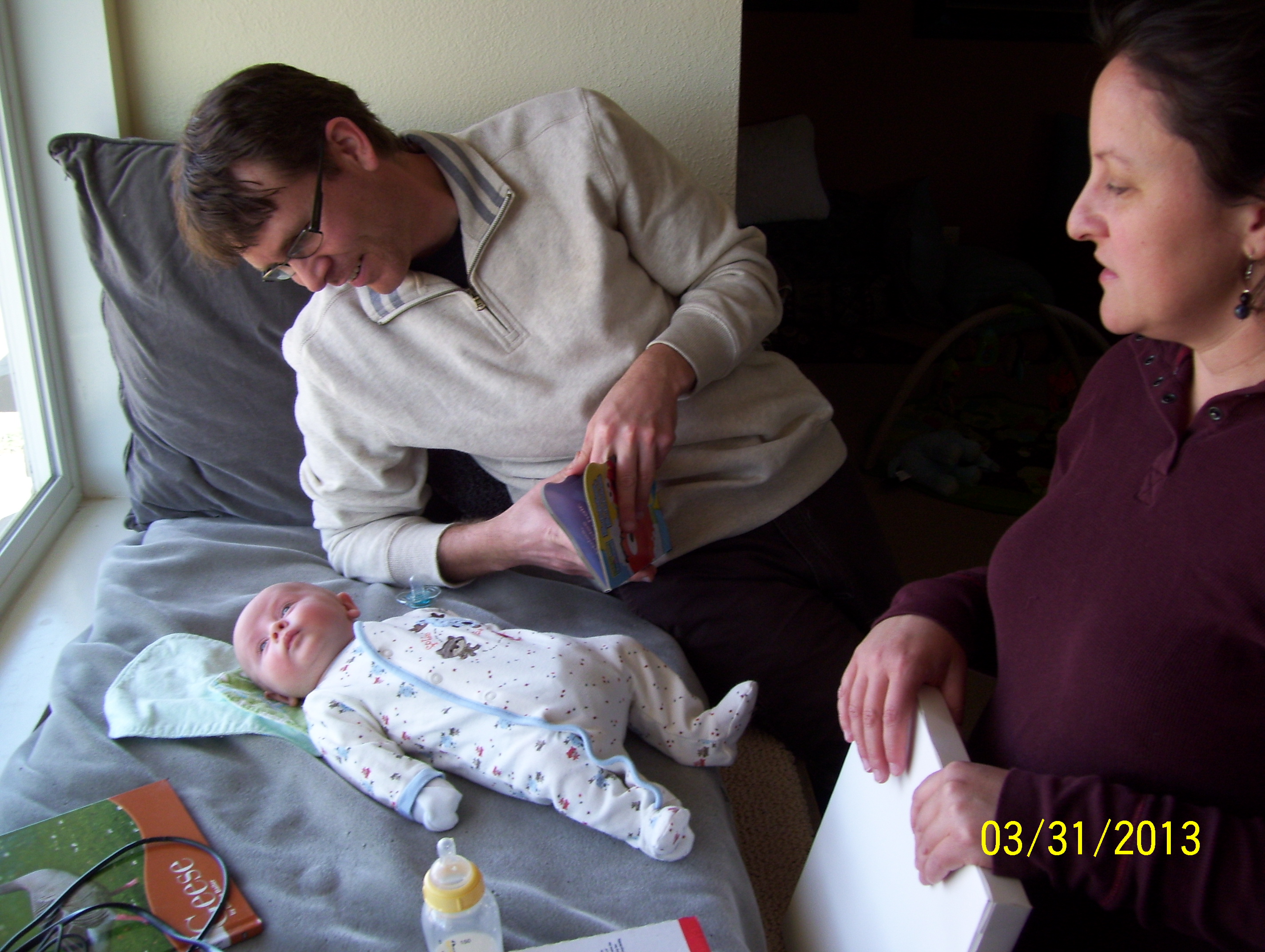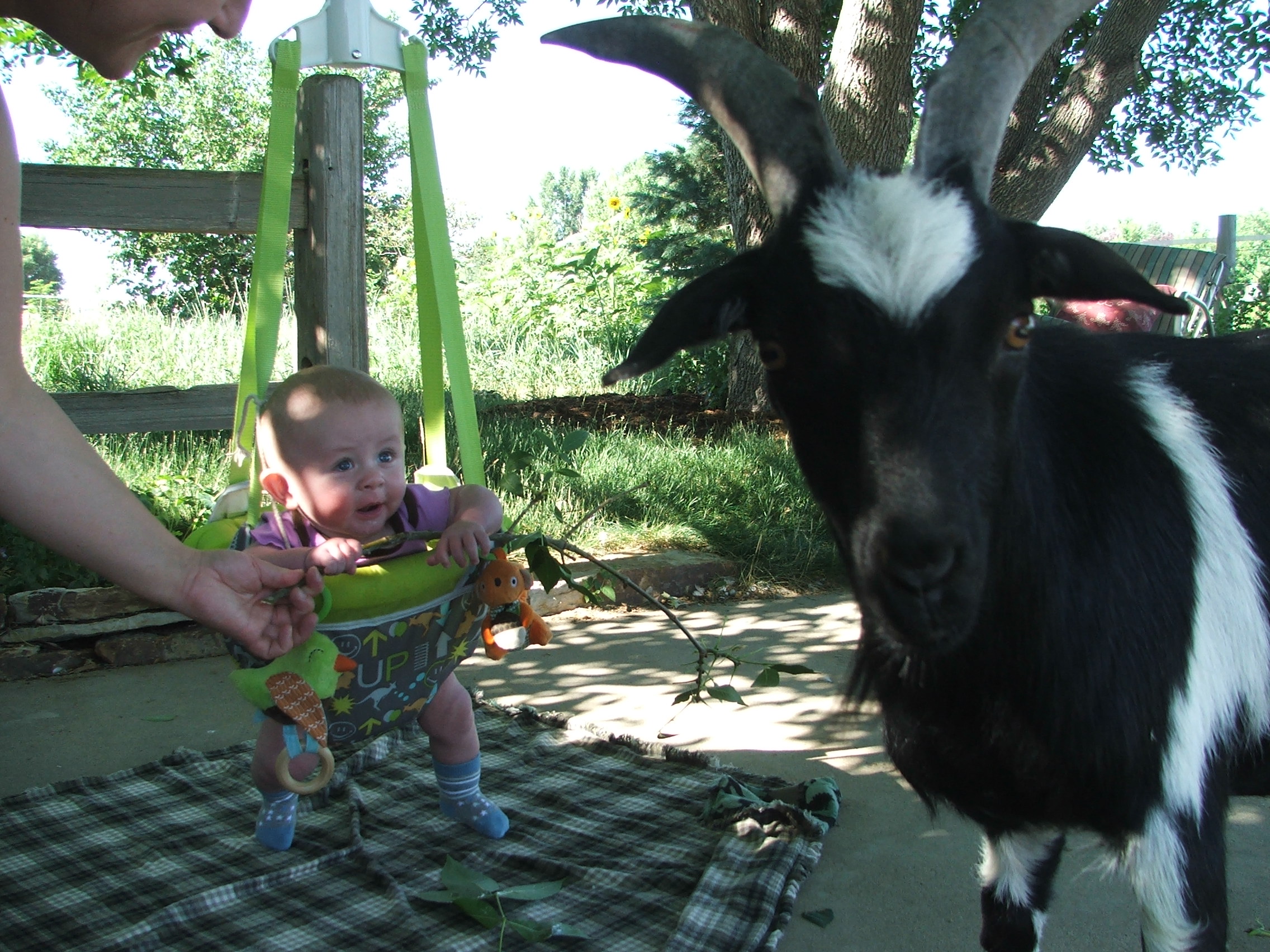 Talus in his Johnny Jump Up outside with Mom and goat Bart, June 2013, Goathead