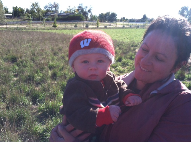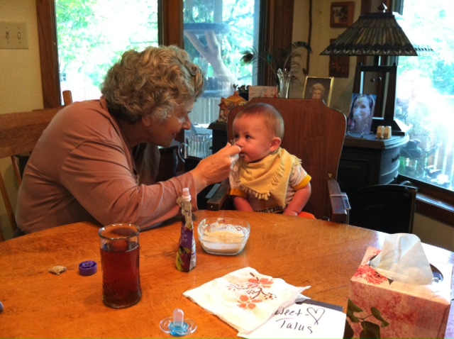 Grandma Rosalyn feeding Talus, October 2013, Grandparents Farm in Northfield, MN