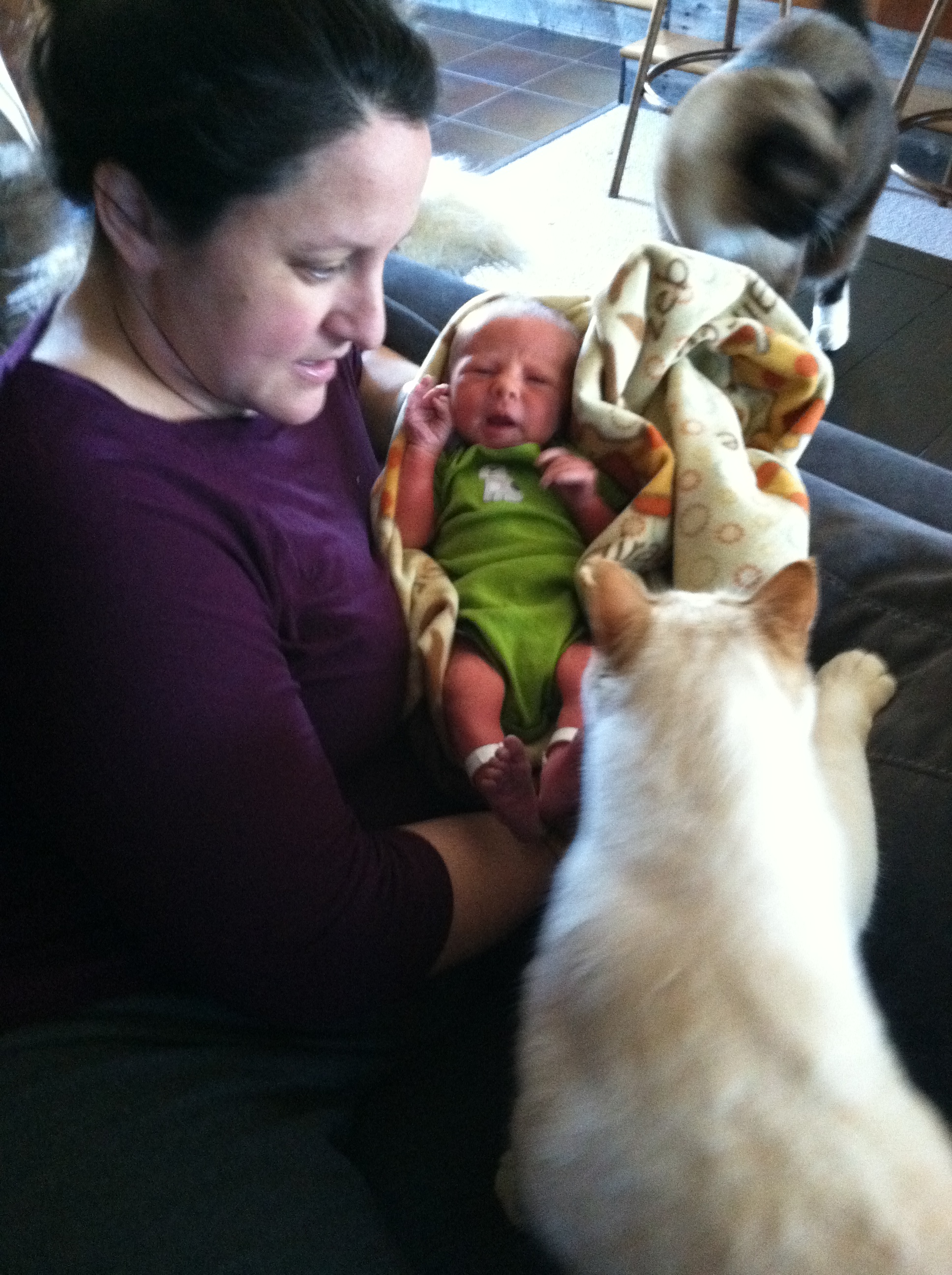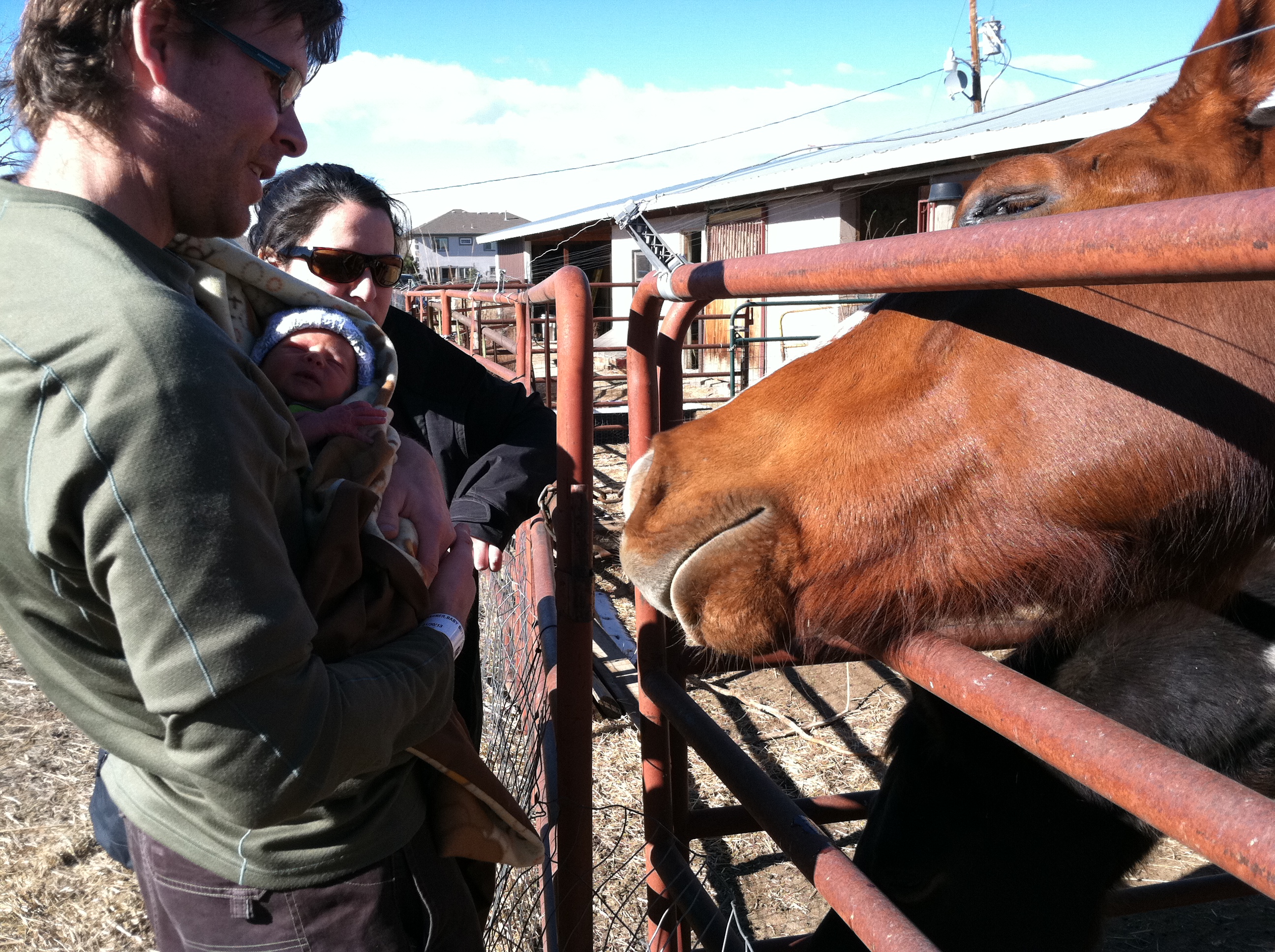 Talus meeting Phatom Fog on his first day home, Feb 2, Goathead.